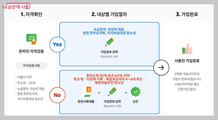 | 수급권자, 차상위계층 가구, 법정 한부모가족 및 국가보훈 대상 청소년 | 1. 서울런 누리집에서 온라인 자격 검증 2. 서울런 회원가입 후 서비스 바로 이용 가능 |
